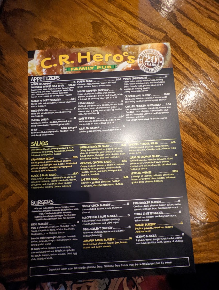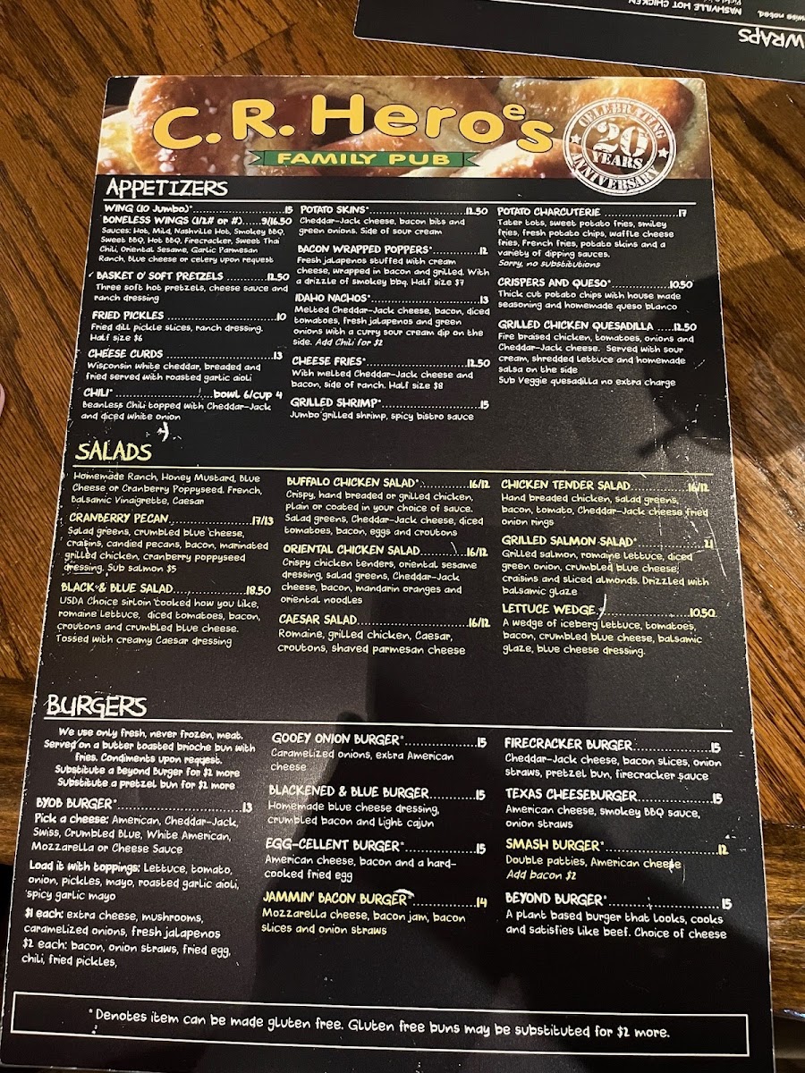 Welcome to the Cr Heroes Family Pub Menu, where comfort food meets a fun, laid-back atmosphere. Whether you're here to kick back with friends or enjoy a meal with the family, there's something for everyone. From juicy burgers and crispy fries to hearty pizzas and fresh salads, the menu is designed to satisfy all tastes. If you're craving a snack, their appetizers like mozzarella sticks and chicken wings are perfect for sharing. Don't forget to check out their specialty dishes - each one crafted with flavor in mind.