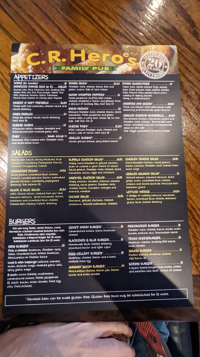 Located at 10570 E 96th St in Fishers, IN, this spot is perfect for casual dining, and it offers a cozy vibe whether you're stopping by for a quick bite or lingering over a cold drink. Pair your meal with a cold beer or a refreshing cocktail from their extensive drink list. The Cr Heroes Family Pub Menu has something to please every palate, making it an ideal choice for your next outing!